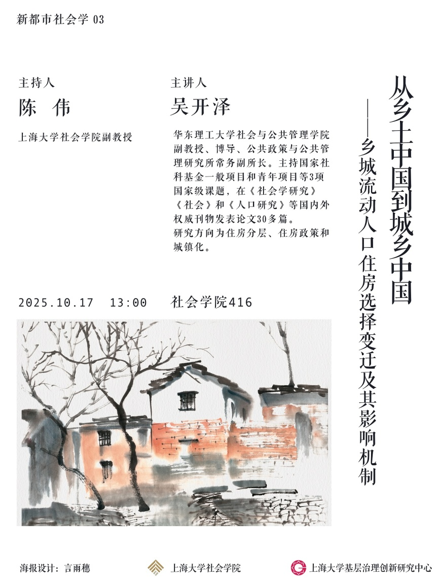 主讲人:吴开泽,华东理工大学社会与公共管理学院副教授、博导、公共政策与公共管理研究所常务副所长。主持国家社科基金一般项目和青年项目等3项国家级课题,在《社会学研究》《社会》和《人口研究》等国内外权威刊物发表论文30多篇。研究方向为住房分层、住房政策和城镇化。