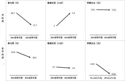 进入“双减”工作全面贯彻落实的2021年秋季学期,数据显示,参加学科类校外培训的小学和初中生为21.7%,比春季学期的参与率下降了26.4个百分点。这一部分学生平均每周用时5.4小时,人均学期支出7326元。与上学期相比,平均每周用时增加了1.4小时,而人均学期支出减少了15元,这说明“双减”工作各项措施的落实不仅显著减少了参加学科类校外培训学生的数量,同时也降低了学科类校外培训的收费,减轻了家长负担。