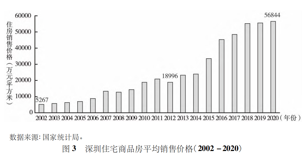 尽管住房市场化取得了巨大成功,但由于国家在住房供应领域的大幅撤退,公共住房的发展和供应数量有限,大多数城镇居民的住房需求主要通过市场满足。在人口净流入的大城市,住房供不应求,价格攀升,住房可负担性不断下降。这种情况在深圳表现得尤为明显。国家统计局数据显示,从2002年至2020年间,深圳住宅商品房平均销售价格上涨了近11倍(如图3所示)。