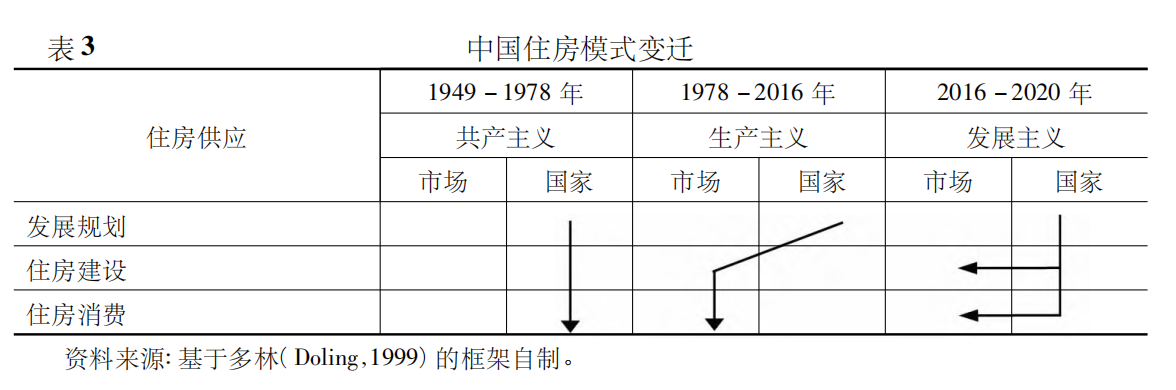 通过上述梳理可以看到,在经济发展的不同阶段,“国家—市场”在住房供应领域里的互动形式有所不同。基于多林(Doling,1999)的住房供应框架展开分析,可以发现,自新中国成立以来,我国多样化的住房规划、建设主体和消费组合构成了三种基本住房模式(详见表3),即共产主义(communist)、生产主义(productivist)和发展主义(developmentalism)。