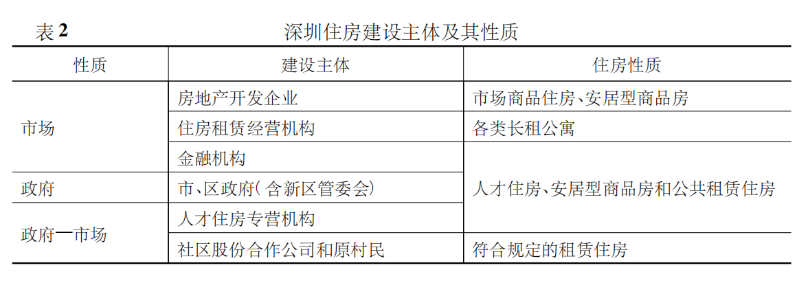 在上一阶段的住房建设中,我国住房供应主体相对单一,并且“泾渭分明”(黄燕芬、张超,2017)。普通商品房主要通过市场机制供给,面向的是城镇高收入家庭;政策性商品房和保障性住房主要通过政府部门供给,目标群体是城镇中低收入家庭和少部分非城镇居民。长此以往,住房供给总量不足、住房供应结构不均的弊端日渐凸显。在推进住房供给侧结构性改革的发展要求下,不少城市和地区在制定“十四五”城市发展和住房发展规划时,都出台了落实“多主体供给、多渠道保障”的政策措施。在此背景下,下一阶段我国住房建设主体将逐渐从市场机制主导转变为“政府—市场”合作、引导和鼓励社会资源参与。在深圳市,社区股份合作公司和原村民、企事业单位、社会组织等也被纳入供给主体(详见表2)。