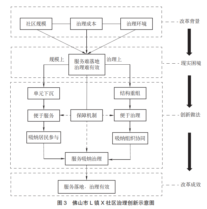 社区作为居民的居住场域和公共生活的叙事空间,其治理的有效性与复杂性往往与治理的基本单元密切相关。社区治理的基本单元一般具有多重复合性,既是服务单元,又是社会单元,同时还是利益单元。这种多重复合性决定了社区治理需要建立一个有效且适度的基本单元,这一基本单元又恰好是城市社区“服务吸纳治理”有效实现的前提条件。如图 3 所示,服务吸纳治理,其初衷是以有效地为社区居民提供公共服务为出发点,以在服务中吸纳居民、社工机构和社会组织参与社区治理为落脚点。因此,服务与治理无缝对接的必要条件就是找到一个有效的服务单元,在此基础上通过制度创新将服务单元转换为治理单元,进而实现社区治理的机制优化。所以,佛山市 X 社区“服务吸纳治理”模式取得成功的关键性步骤就在于服务单元和治理单元的下移。辅之以“服务吸纳治理”中单元下沉的条件之二是治理体系的调整与治理资源的整合,其能与单元下沉呈现出显著的“耦合效应”。通过整合社区内部的治理资源、完善社区治理架构,可大大畅通社区治理的渠道,促使服务吸纳治理更加便捷、高效,进而强有力地提升社区的回应能力,弥补过去问题化解能力的不足。