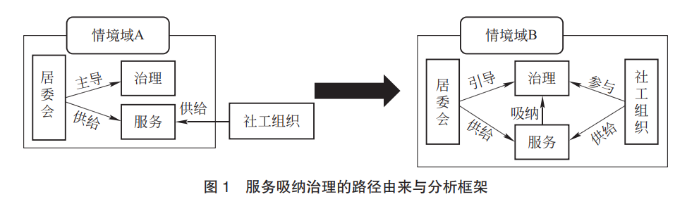 无论是理论层面还是现实层面,城市社区的居民融入、融合等“共融”氛围相对不足。而过去既有的不论是服务促进治理抑或是服务协同治理模式,均是将服务本身与服务主体挡在社区共同体之外,尤其是将服务主体与居民主体相区隔,这就导致无论基层如何以服务促进协同治理,均无法取得治理的良效。相反,服务吸纳治理(如图 1 所示)则是将社区治理看作是一种合作共治的过程 (情境域 B),一改过去服务与治理的区隔状态(情境域 A),将供给公共服务的市场组织吸纳进社区共同体之中。