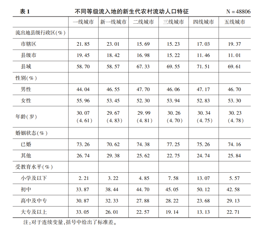 表1展示了不同城市等级流入地中流动人口在流出地和人口社会经济属性等方面的差异。从流出地来看,除上述展示的来自不同城市等级的新生代农村流动人口在流入地选择上的差异外,来自不同类型县级行政区的流动人口在不同城市等级流入地中的占比也存在明显差异。来自市辖区和县级市流动人口的占比随流入地城市等级的降低呈下降趋势。来自县域的流动人口则呈现相反趋势,在等级较低的城市中所占的比重明显较大。从人口的社会经济属性来看,男性在一线城市的比重相对较低(44.04%),而在其他等级流入地无明显差异。已婚群体在低等级城市,如三线、四线和五线城市中的占比相对较高。受教育水平较高的群体比重随着城市等级的降低而下降。具有高中及中专、大专及以上学历的流动人口流入一线城市、新一线、二线城市的比例明显高于其他低等级城市,反映了人才的空间集聚。