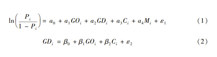 在式(1)中,Pi表示新生代农村流动人口i在流入地城市获得住房产权的概率;GOi表示流出地特征,包括流出地的城市等级和县级行政区类型;GDi为中介变量,即流入地城市选择,具体用流入地的城市等级来表示;Ci表征流动人口的社会经济属性,包括性别、年龄、婚姻状况、受教育水平、职业类型等;Mi表示流动特征,包括迁移的总时间、迁移次数和迁移形式。其中,流动人口流入地城市选择也会受到其流出地特征和部分社会经济属性的影响,如公式(2)所示。