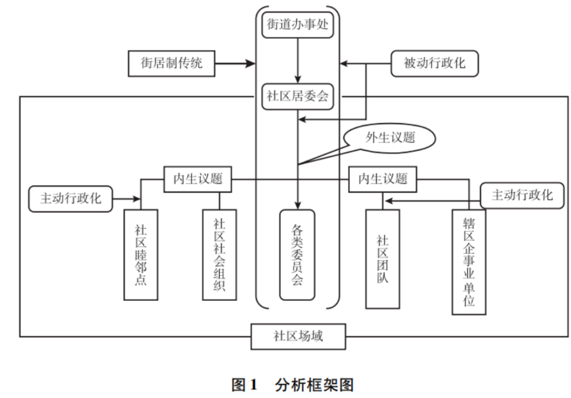 其三,被动分析有余,主体策略下的积极面相则鲜有提及。研究多聚焦于“压力型体制”下基层政府的被动应对策略,比如,学者们提出“变通”“共谋”“应对”“选择性政策执行”“选择性应对”等概念来分析地方政府尤其是基层政府在各种环境和条件约束下所呈现的策略行为。上述研究应当说较好地把握与透视了基层政府的行为逻辑和策略选择,无疑对回答居委会在压力型体制下的被动行政化具有重要的参鉴价值。但是,社区居委会毕竟不是基层政府,尤为重要的是居委会作为组织载体而发生的“下向”互动实践某种意义上被学者们有意或无意忽视了,即作为主体的居委会在社区场域中与社区自组织、社区单位、企业以及社区居民,也包括居委会作为实体其自身构成之间的关系与互动的情景呈现和逻辑表达存在空白或者说缺憾。笔者认为,对该路向的认识与解读是探究居委会行政化议题具有更大价值的分析面相。由此,在拉长街居研究传统链条的基础上,以社区居委会为中心和对象,对居委会在社区治理实践中可能存在的主动或者说积极行政化进行探析,就构成本研究的主要关切。