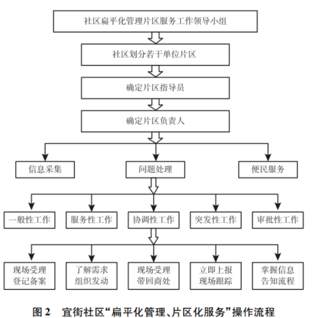 居委会上述片区化服务的组织架构同时也是一种工作展开的网络与载体,本身就是一种工作方法、一种“上下联动、运转有序、逐层管理、逐级负责”的社区工作模式。一方面,扁平化管理片区服务的操作流程具有“层层分解”的程序规范,从划片分区到人员配备以及工作的具体开展等呈现一个逐级分解、层层落实的过程(见图2)。另一方面,任务的布排与落实具有“自上而下”的路径惯性。“社区—片区—居民小组—楼栋”的组织网络体系,与“指导员—片长—居民小组长—楼道长”的工作人员队伍相互耦合、彼此嵌套,使得居民自治管理和政府的各项服务工作可以通过这个网络体系和人员安排得以落实到每家每户,这已经成为一种典型的社区工作开展模式。