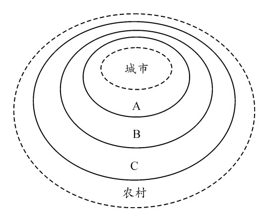 空间梯度不仅体现了郊区社会结构的非均质性,而且蕴含了郊区社会转型的基本秩序。从空间区位上看,越是靠近城市,郊区社会的市场化和集体化的动力愈强,二者的张力愈强;越是远离城市中心,郊区社会的市场化和集体化的动力愈弱,二者的互补性愈强。据此,可以大致将郊区划分为核心层、中间层和边缘层,具体如图1的A、B、C区域所示。