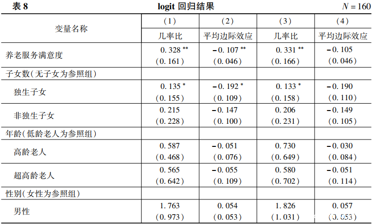 如前文所述,入住养老机构的老年人的养老服务供需差最大值为5,在养老机构提供且老人们也明确表示享受到的生活照料(饮食、打扫卫生、洗澡穿衣、陪同外出)、医疗保健、紧急救援、心理护理(精神慰藉、心理支持、咨询等)以及休闲娱乐活动中,有不少并不是老年人急需的养老服务项目。供需差中最小值为-3,意味着养老院提供的养老服务供不应求,老年人的养老服务需求迫切。为探究当前老年人的机构养老服务供需是否匹配,我们将“养老服务供需差”作为因变量,养老服务需求较弱(供需差大于0)的设置为0,养老服务需求迫切的(供需差小于等于0)设置为1。同时,根据此次调查问卷数据的可获得性,选择老年人年龄、子女数量、养老机构居住时间、养老院获知途径、机构养老费用支付者、养老服务总体满意度、养老院居住习惯程度作为自变量,重新赋值并处理为虚拟变量。通过具体询问老年人对其养老院提供的饭菜质量、住宿环境、活动空间、娱乐活动、医护人员服务态度、护理人员服务态度、行政管理人员服务态度、公共基础设施、生活照料、医疗护理、文化娱乐、精神慰藉、收费价格这13项服务的满意度,进一步做简单算术平均计算得出养老服务的总体满意度。此外,考虑到养老机构类型、地区对老年人服务供需会产生影响,因此加入机构类型、地区作为固定效应变量。根据设定,我们对调查数据做了logit回归分析,结果如表8所示。