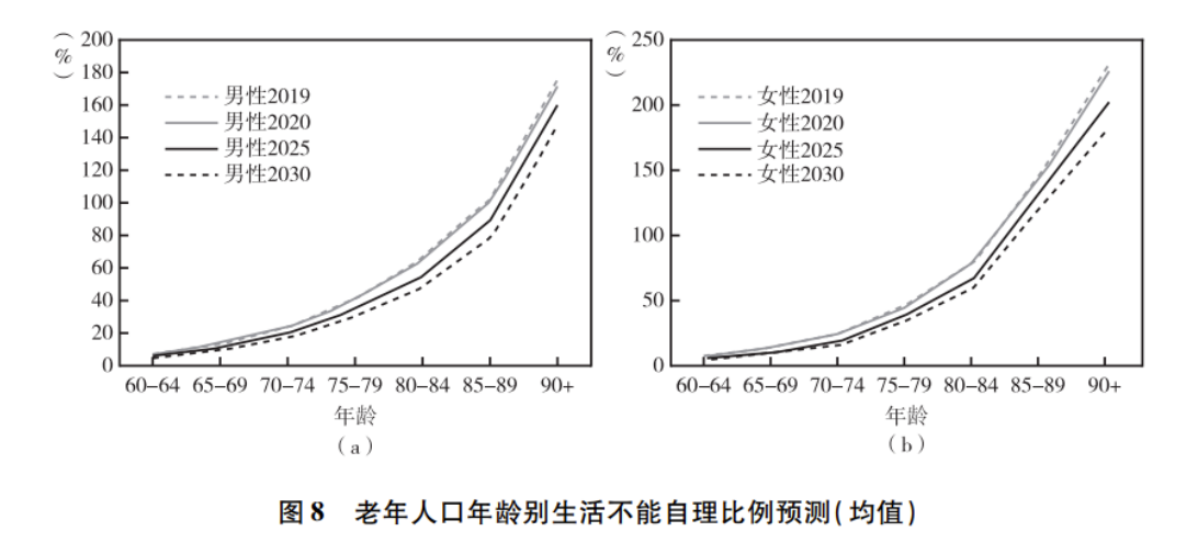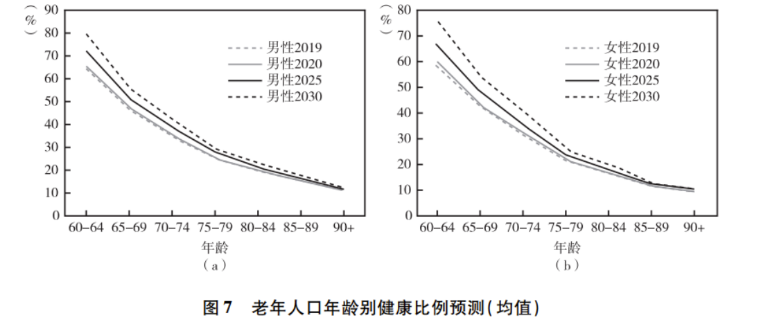第三,根据年龄别死亡率的变化趋势,预计从2020年到2030年,老年人口年龄别死亡率下降趋势明显,无论男性还是女性老年人口,高龄老人年龄别死亡率下降的幅度远大于低龄老人。年龄别死亡率下降的结果不仅影响老年人口平均预期寿命,而且直接影响老年人口的健康预期寿命。