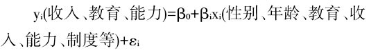 若图2大体准确描画了“能力说”的思路,则一方面,将教育、职业、收入、能力视为贫困本身不妥;另一方面,由图2还可知,收入既是贫困的测量(在这里它是Y),也是招致贫困的可行能力的影响因素(在这里它又是X)。换言之,收入既是因,也是果;由此,将能力视为贫困所存在的问题不言自明。若不加以区分,则不仅在学理上会误解贫困的本义,曲解“元核心”“源要素”“衍要素”之间的关系,而且也会带来经验研究的偏误:贫困既出现在等式的左边,也呈现于等式的右边,即: