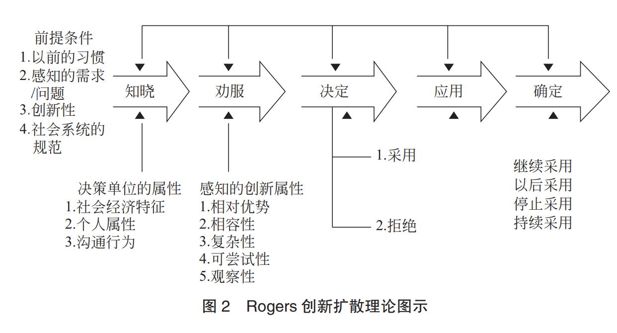 根据Rogers的创新扩散理论,创新扩散这一过程分为知晓、劝服、决定、应用、确定五个阶段(见图2),Rogers还提出了“创新扩散”的基本假设。在知晓阶段,个人会接触创新并了解创新的工作原理。在劝服阶段,个人基于在知晓阶段所构建的知识对创新形成有利或不利的态度。在此阶段,相对优势、相容性、复杂性、可尝试性和观察性等创新属性对态度形成具有重大影响。相对优势(relativeadvantage)是指创新被认为比其替代的现有想法、实践和对象更好的程度。相容性(compatibility)是指个人的现有价值、过去的经验、需求和创新被视为一致的程度。复杂性(complexity)指的是理解和利用创新相对较难认识的程度,感知程度越高,与采用创新的关联就越负面。可尝试性(trialability)是指潜在的创新采用者在有限的情况下可以体验创新的程度。观察性(observability)是指潜在的创新采用者可以看到他人采纳创新成果的程度。越容易观察到创新成果,并且与他人越容易交流,创新的采用率就越高。在决定阶段,个人根据劝服阶段形成的态度决定是否采用或拒绝创新。在应用阶段,个人最终决定采用还是拒绝创新。当个人决定利用创新时,便会实施应用。在最终的确定阶段,个人会根据对创新使用结果的满意程度重新考虑对创新的使用,并就将来是否继续使用创新做出决策。