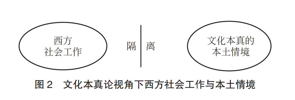 与主张“放之四海而皆准”的普世论相反,文化本真(authenticity)概指那种不证自明的先验存在式的文化本质主义观点,主张本土内生知识的根本性。道德哲学家查尔斯·泰勒将其界定为“忠实于我自己和我自己独特的存在方式的理想”。文化本真论以强调特殊性、相对主义的后现代哲学为基础,常常在自我—他者框架下批判主流文化对非主流的他者化;认为西方所谓普世论的社会工作也不过仅仅是多元中的一元——西方白人男性文化的产物——而已。极端的文化本真论认为不同的文化体系之间具有不可通约性,文化的不可通约性在宏观层面可能导致亨廷顿所谓的断层线战争。社会工作界文化本真论的持论者多为美国非裔社会工作研究者,认为认识论本质上会受到历史、文化和意识形态的约束,强调有历史传承的共同体对于成员的濡化功能以及使能作用,指出非裔美国人只有在不脱离其本民族的本真性时才具有真正的创造力和切实做出改变的能力。法伊-金将社会工作本土理论(indigenisttheory)定义为由国内和国际上的本土学者和研究者发展而成的一种解放和增能理论,谋求尊崇本土知识的范式转换。在国际社会工作界,原生知识和经验越来越受到瞩目,提倡和交流本土知识和实践的国际社会工作本土声音会议(InternationalIndigenousVoicesInSocialWorkConference,IIVSWC)到2020年也已经举办了六次。这固然可以在后殖民主义背景下将其视为后发国家和地区在学术领域采取的解放行动策略,但更为可能的是西方社会工作知识体系与本土情境互动中激起的反思的产物。这一文化本真论的逻辑可以用图2作如下表达,其中隔离指的是两种文化系统之间的不可通约性。