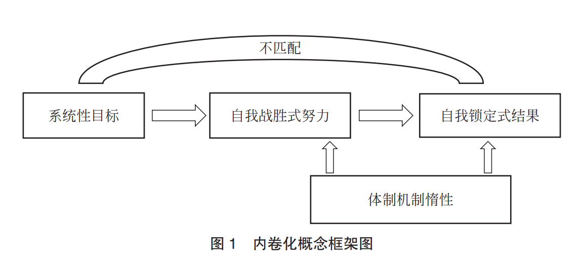 通过对不同学者的内卷化理论进行深入分析,笔者发现,行动者的系统目标与行动结果并不一致,这取决于多重因素的共同作用。印度尼西亚爪哇地区希望农业向外延伸扩展,但是资本与土地被锁定,只能以内部细节过分精细的刚性形态的获得作为结局;华北和长江中下游小农希望能够尽量减少劳动力投入并提高产量,但是由于家庭式农场不具备弹性,在有限土地上投入大量劳动力获得了总产量的增长,但是单位劳动的边际效应却发生了递减。如果对相关理论进行归纳,可以将内卷化看作是一个行动者实现系统目标的过程,在此过程中由于既有体制与制度的约束作用,尽管行动者在进行着“自我战胜式”努力,但是最终却达成“自我锁定式”结果(如图1所示)。具体来看,内卷化产生的主要原因在于既有制度或者体制的约束,也就是说,造成内卷化的根本原因在于旧有体制的强大惰性;为了实现系统目标,尽管存在原有制度与社会关系的束缚,但是行动者通过一系列策略进行着努力;但是,由于条件与边界限制,原有系统目标未能达成,自我锁定、无法突破的非理想型组织变革形态成为最终的结果。应该说,此概念框架能够在一定程度上弥合各个内卷化理论基于领域特殊性所带来的概念分歧,并提升了内卷化理论对于不同领域及问题的理论解释能力。