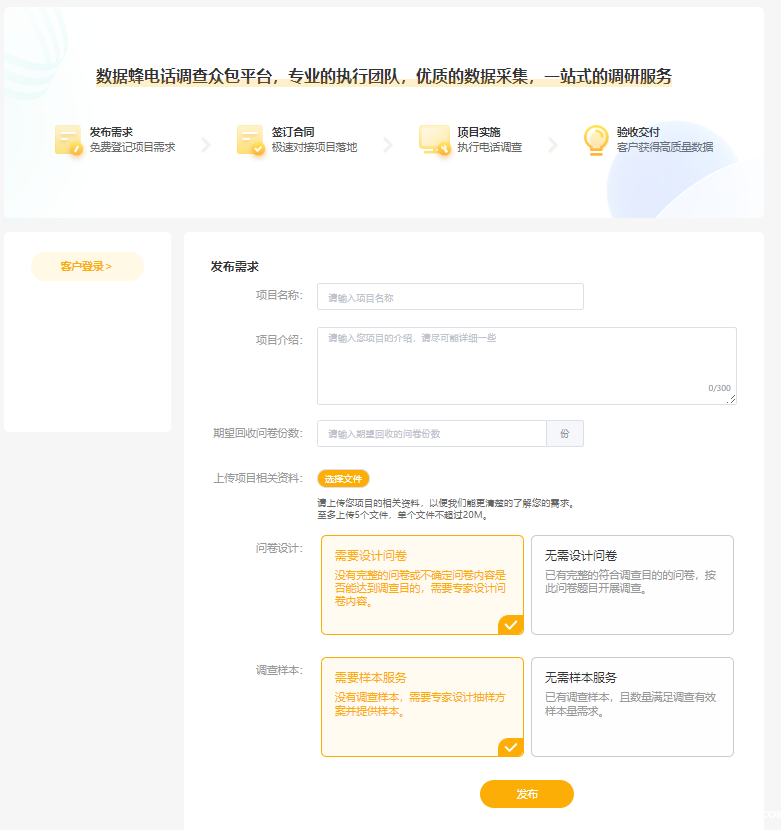 登录网址https://www.databeehub.cn/,点击“发布需求”,按照下方具体流程即可登记您的调查需求!